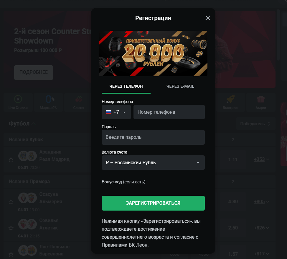 Онлайн регистрация в казино Leonbets проходит стандартно. Новичкам потребуется открыть форму нажатием на кнопку и ввести персональные данные. Следует написать почту или телефон, выбрать страну проживания и валюту счета, скопировать промокод, если есть, а также согласиться с правилами.